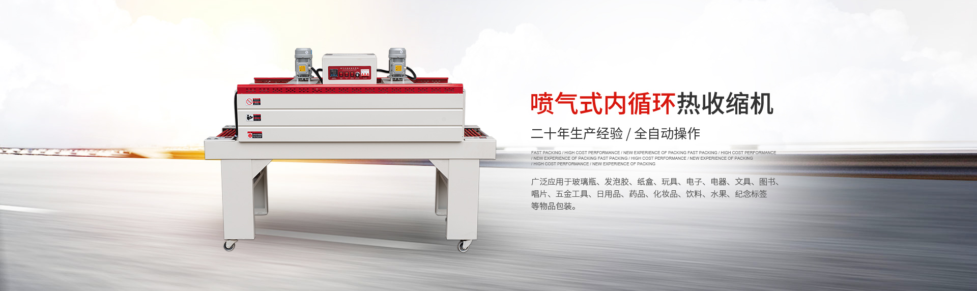 現(xiàn)主要產(chǎn)品有:全自動 L 型、邊封薄膜封切機、節(jié)能噴氣式內(nèi)循環(huán)熱收縮機、貼體包裝機、吸塑包裝機、高周波塑膠熔接機、袖口式套膜機、枕式包裝機等多個系列的包裝機械